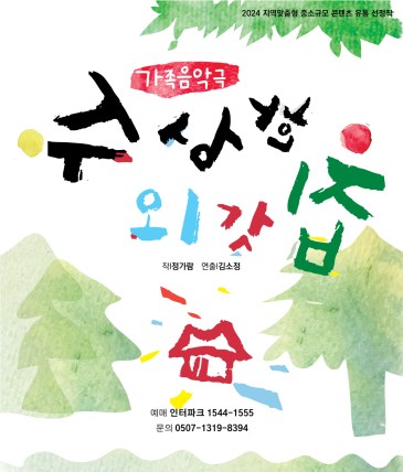 가족음악극수상한 외갓집 ‘지신밟기’의 재탄생 2019 산청문화예술회관 문화가 있는 날 2020-21 종로문화재단 아이들극장 창작지원작품 선정 2020-21 서울아시테지 겨울/여름축제 선정 2021 대한민국연극제, 강남문화재단, 김해국제가족극축제 2022 국립무형유산원, 아시테지 봄 나들이 2023 용인문화재단, 남도국악원, 김천국제가족극축제, 서울시민청, 성수문화재단, 천안어린이꿈누리터 2024 거창국제연극제, 지역맞춤형 중소규모 유통지원사업 김천국제가족극축제 동상 수상 총 65회 공연 다음 콘텐츠 보기